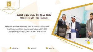 تهنئ شركة PCI خبراء تطوير التعلينم لحصولها على شهادة الجودة العالمية الايزو(iso9001-2015) متمنية لها مزيد من التطوير